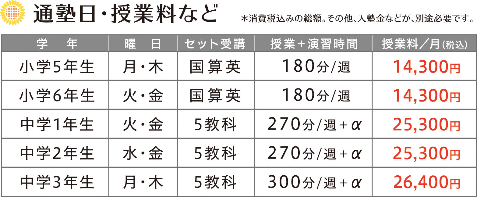 ○ セット受講が基本となっております。○ 春の入塾キャンペーン期間中は、入塾金がお得になります。(4月末日まで)○ 兄弟姉妹割引など、さまざまな割引もございます。○ 中学部のみ『授業+演習時間』以外に、『自習の日』がございます。 (詳しくは、『中学部の指導内容』をご覧ください。)