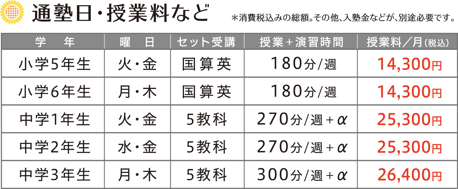 ○ セット受講が基本となっております。○ 春の入塾キャンペーン期間中は、入塾金がお得になります。(4月末日まで)○ 兄弟姉妹割引など、さまざまな割引もございます。○ 中学部のみ『授業+演習時間』以外に、『自習の日』がございます。 (詳しくは、『中学部の指導内容』をご覧ください。)